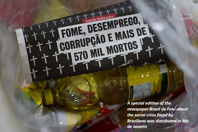 The distribution of basic-need grocery packages had a moment of conversation about "What does Brazil need to be independent?". At the event, participants received a special edition of the newspaper Brasil de Fato approaching “Hunger, unemployment, corruption and more than 570.000 dead”.