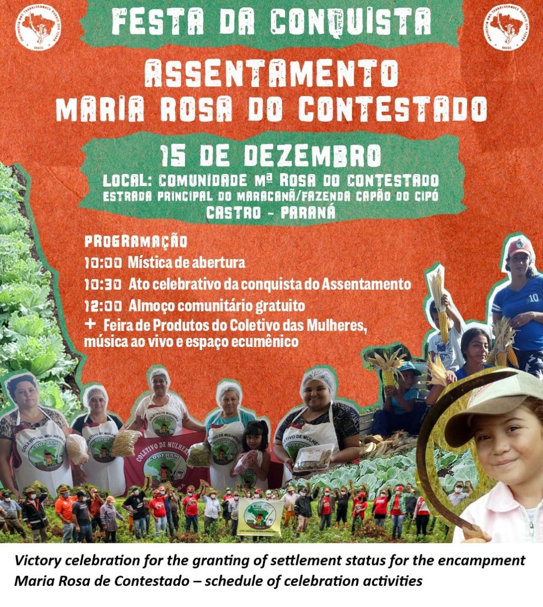 The celebration party will be this Friday (12/15), at the community headquarters, starting at 10 AM, with a community lunch and free barbecue, a Women's Collective product fair, an ecumenical space and a dance. The superintendent of the National Institute of Colonization and Agrarian Reform (INCRA-PR), Nilton Bezerra Guedes, and the national president of the Workers' Party (PT) and state deputy for Paraná, Gleisi Hoffmann will be present; in addition to state and regional authorities, members of universities and partner organizations.