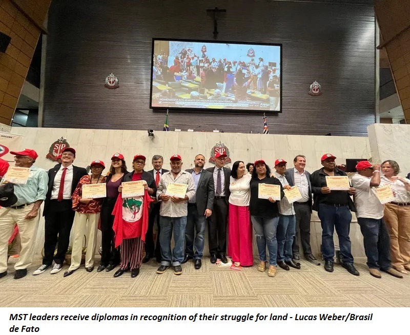 Gilmar Mauro, a member of the MST's national coordination, celebrated the tribute organized by state deputy Simão Pedro (Workers’ Party), which was signed by all Alesp’s members of the Workers’ Party (also known as PT), Socialism and Liberty Party (Psol) and Communist Party of Brazil (PCdoB).