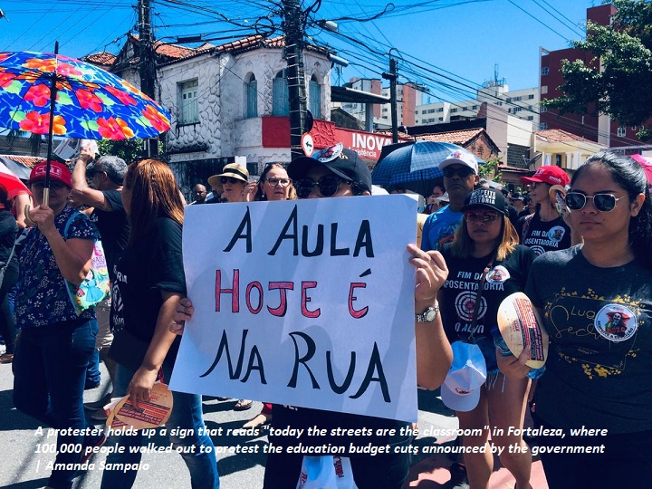 In the Northeast, the biggest demonstrations took place in Fortaleza, where 100,000 gathered to defend public education, and in Salvador, where 50,000 walked out to protest the setbacks of the far-right government.