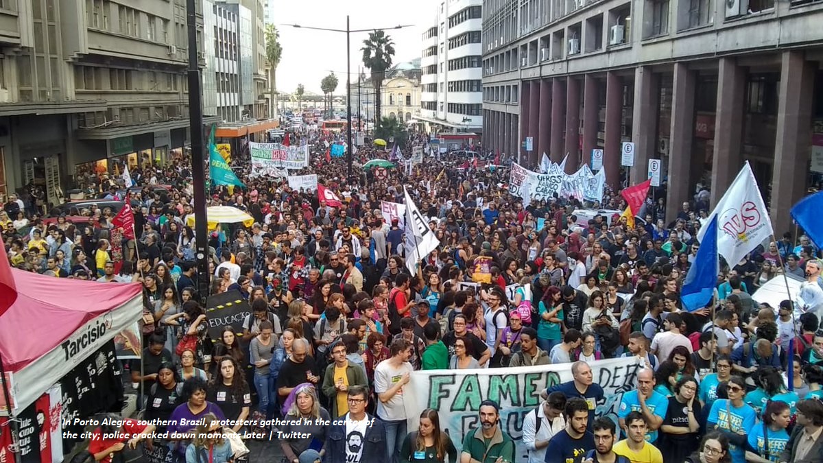 The police also cracked down on the protest in Porto Alegre, a capital city in southern Brazil, where 20,000 people gathered in the afternoon outside the Federal University of Rio Grande do Sul, shooting rubber bullets and teargas at demonstrators.
