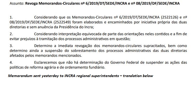 After Repórter Brasil reveals internal documents determining the suspension, INCRA changes its mind and cancels the memorandums. Civil servants assess that the government is lost.