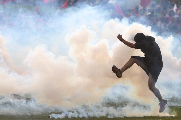 An anti-government demonstrator kicks back a tear gas canister during a clash with riot policemen during a protest against a constitutional amendment, known as PEC 55, that limits public spending, in front of Brazil’s National Congress in Brasilia, Brazil November 29, 2016. REUTERS/Adriano Machado