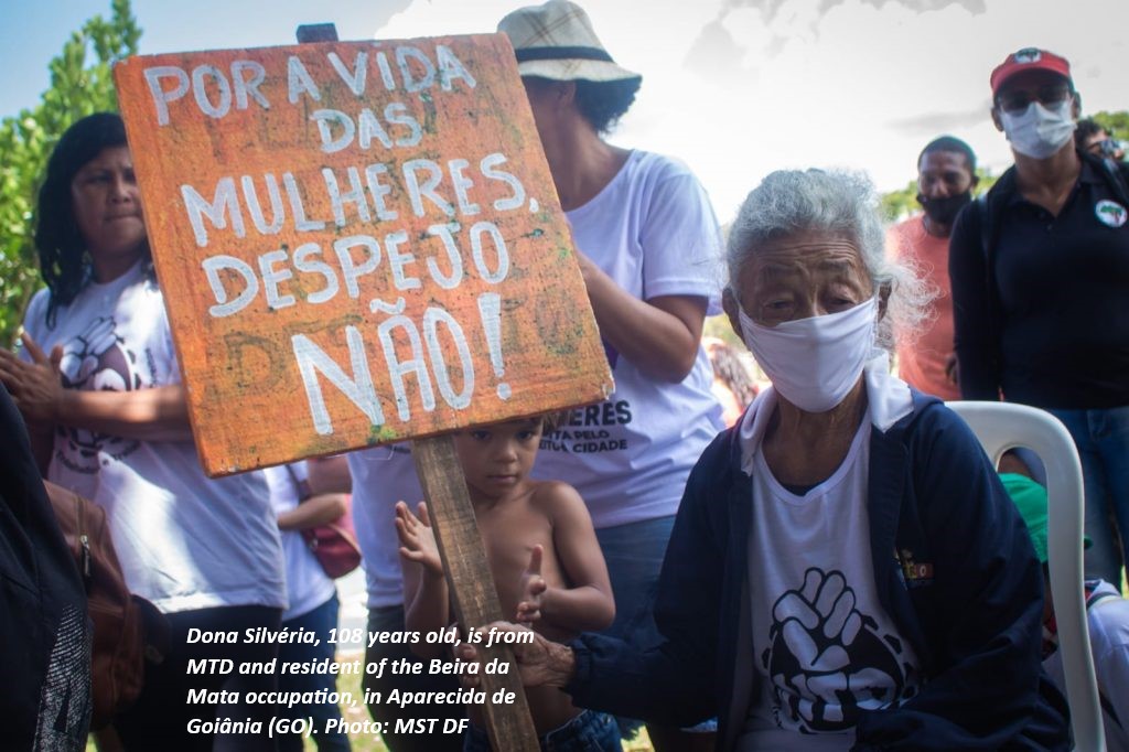 Among the people mobilized and threatened with eviction was Dona Silvéria, 108 years old, who is part of the Movement of Workers and Workers for Rights (MTD) and lives in the Beira da Mata occupation, in Aparecida de Goiânia (GO). She joined the mobilization in Brasília, for the extension of ADPF 828 and her right to housing and permanence in the occupation during the pandemic.