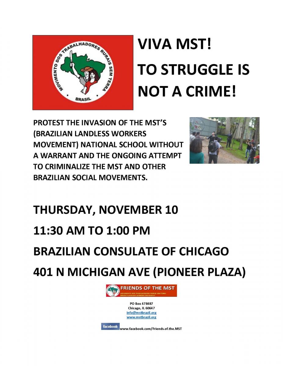 The Friends of the MST, along with allies in other social movements, responded to the invasion of the MST’s national school (Escola Nacional Florestan Fernandes) (see article above) by organizing demonstrations in front of the Brazilian embassy in Washington D.C. and the Brazilian consulates in New York, Boston and Chicago.