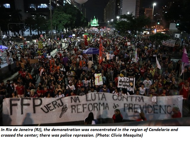 The General Strike Day was marked by demonstrations and mobilizations against pension reform throughout the state of Rio de Janeiro. At the end of the demonstration that gathered around 100,000 people in Rio's center, according to organizers, the Military Police dispersed workers and students firing tear gas bombs.
