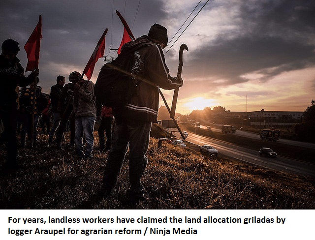 For years, the movement has claimed the griladas land[i] held by logger Araupel should be used for agrarian reform. About 3,000 families occupy part of the lands of the Pinhal Ralo and Rio das Cobras Farms in four camps: Dom Tomás Balduíno, Herdeiros da Terra de 1º de maio, Vilmar Bordim and Leonir Orback.