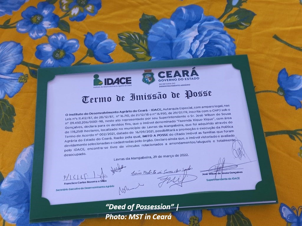 Yesterday morning (March 29), the Landless Rural Workers Movement (MST) conquered yet another Agrarian Reform settlement area, with the possession of the former Xique-Xique farm, located in the municipality of Lavras da Mangabeira, 414 kilometers away from Fortaleza, which will settle 15 Landless families.