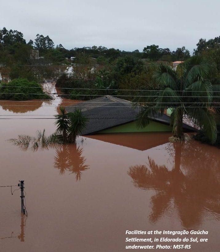 The floods in RS have also caused incalculable damage and losses for 420 landless families, who were affected by flooding, flooding of homes, loss of food production, damage to structures, tools, machinery; beyond the lives of animals. In total, six MST settlements that were affected are in the metropolitan region of Porto Alegre and in the central region of the state, they are: Integração Gaúcha (IRGA) and Colônia Nonoaiense (IPZ), in Eldorado do Sul; Santa Rita de Cássia e Sino, in Nova Santa Rita; September 19th, in Guaíba and Tempo Novo, in Taquari. The Landless People's assessment is that with collective struggle and public policy investments, reconstruction is possible, based on new social, ecological and productive matrices.