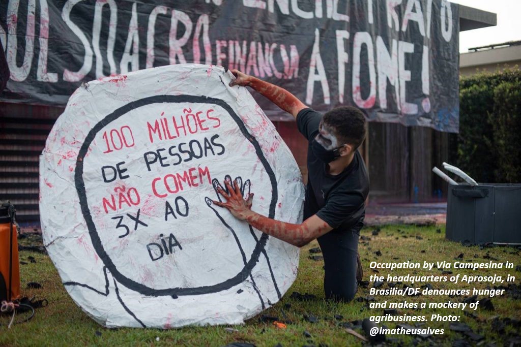 “Our October day brought important elements, the first was the denunciation. To denounce that a country with large soybean and corn producers has many people going hungry, many people without food, without jobs, without homes, without a place to live. That was the case of Aprosoja [Brazilian Association of Soy Producers] that Via Campesina denounced. Therefore, we denounce companies that support anti-democratic acts, but that also profit from the people’s hunger, profit from inflation, from the price of food and from the government’s neglect of the people,” he denounces.