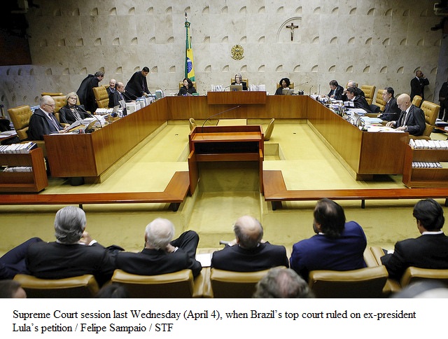 After Chief Justice Carmen Lúcia delivered her opinion in last night’s session (4), by 6-to-5 vote of the Supreme Court of Brazil (STF) ruled against the preventive habeas corpus petition filed by ex-president Luiz Inácio Lula da Silva’s defense team in an effort to prevent judge Sérgio Moro to order his arrest.